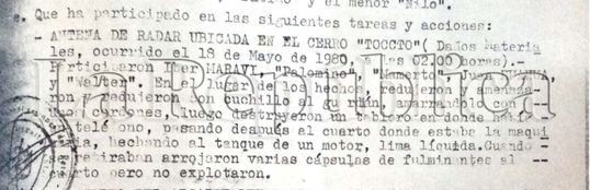 ‘’Que ha participado en las siguientes tareas y acciones: Antena de radar ubicada en el cerro Toccto (daños materiales ocurrido el 18 de mayo de 1980, a las dos de la mañana). Participaron Iber Maraví, ‘Palomino’, ‘Mamerto, Juan Huayhua y ‘Walter’’’.