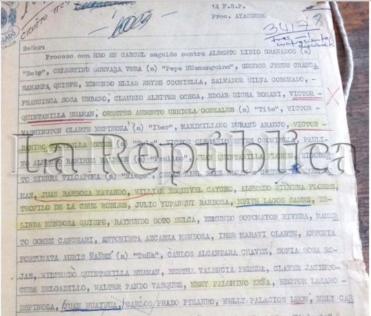 Documento de la 14ª Fiscalía Superior en lo Penal de Lima, a cargo de Felipe Sánchez Espinoza, donde se observa a cabecillas senderistas y sus operadores, entre ellos Iber Maraví Olarte. El caso sí se judicializó.