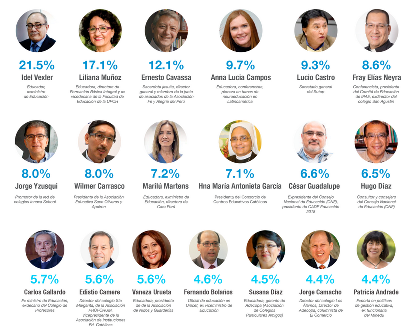 El Grupo Educación al Futuro, institución que orienta sus acciones a implementar proyectos de información, investigación, asistencia técnica y difusión de la oferta educativa en nuestro país, realizó un sondeo sobre las personalidades más influyentes en la educación peruana en tres categorías: educación básica, educación superior, y en innovación y tecnología educativa.