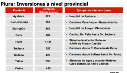 “Estamos reservando los recursos para impermeabilizar Piura, necesitamos intervenir la parte alta de Piura y para ello se destinarán 1,100 millones de soles”, señaló De la Flor. Asimismo anunció la ejecución de los sistemas de drenaje pluvia para Piura y Sullana.