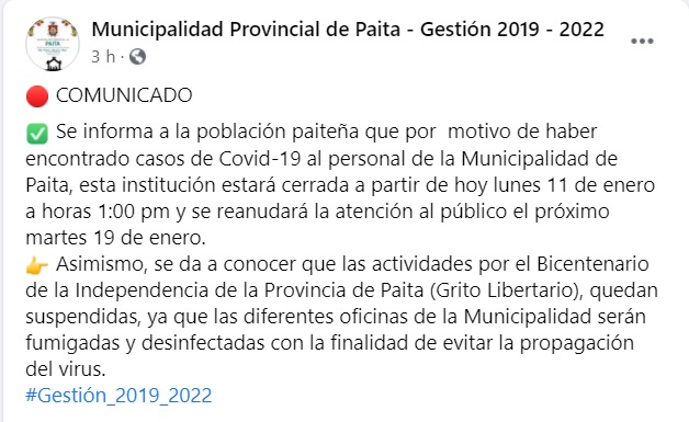Desde este lunes 11 de enero, la Municipalidad Provincial de Paita suspendió sus labores presenciales hasta el próximo martes 19 del presente mes, debido a que algunos de sus trabajadores contrajeron la Covid-19.