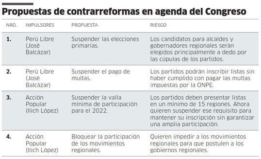 A diferencia de la confrontación por el balance de poderes, los partidos políticos Fuerza Popular y Perú Libre han demostrado que sí pueden unir esfuerzos, pero para lo malo. Hoy jueves 21 de octubre el Pleno del Congreso podría aprobar al caballazo un paquete de contrarreformas electorales, incluida la suspensión de las elecciones primarias para los comicios regionales y municipales del 2022.