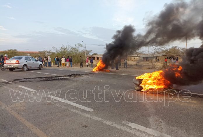 Los agricultores han colocado piquetes en la carretera Piura-Sullana. Solo se permite el paso de ambulancias y personas que requieren de atención médica. Decenas de vehículos están a la espera de que la Policía despeje la vía.