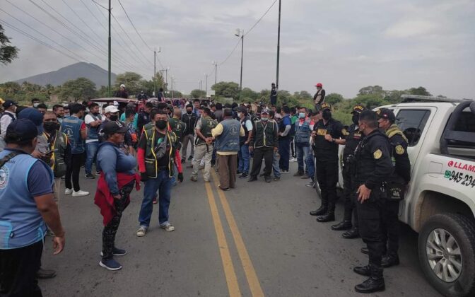 - La carretera Sullana -Tambogrande, a la altura del centro poblado de Cieneguillo, se encuentra bloqueada con vehículos y llantas, y un aproximado de 30 manifestantes.