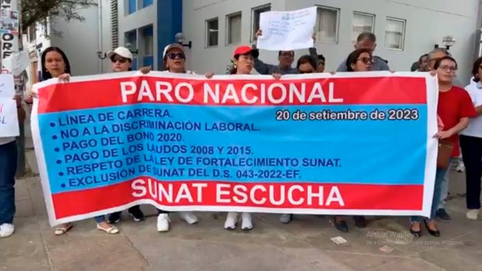 Los trabajadores de la Superintendencia Nacional de Aduanas y de Administración Tributaria (SUNAT) de diferentes regiones se unieron al paro nacional para exigir una línea de carrera e igualdad de condiciones laborales para todo el personal.