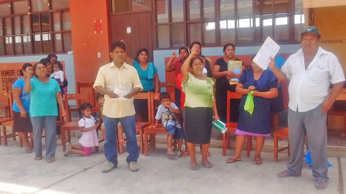 Los padres y madres de la IE N°14042 de Pedregal Chico protestan en las afueras del plantel en rechazo a la  ex directora, Rita Palacios Palacios, porque el año pasado no rindió el dinero para mantenimiento del plantel.