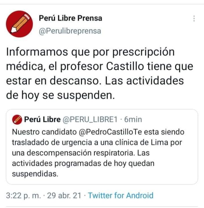 El candidato presidencial Pedro Castillo es trasladado de urgencia a una clínica de Lima por una descompensación respiratoria, según informó su partido Perú libre esta tarde.