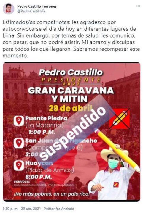 A través de sus redes sociales, la agrupación precisó que por esta condición de salud del profesor cajamarquino, las actividades proselitistas programadas para este jueves se suspenden.