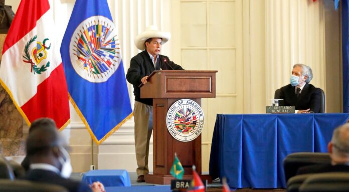 El presidente Pedro Castillo sostuvo que la inversión es piedra angular para el desarrollo del Perú, durante su presentación en la sesión del Consejo Permanente de la Organización de Estados Americanos (OEA). A su salida del recinto en Washington, el jefe de Estado atendió a algunos medios internacionales y peruanos, en un breve diálogo en el que confirmó el respeto hacia la inversión privada que fomentará desde su Gobierno.
