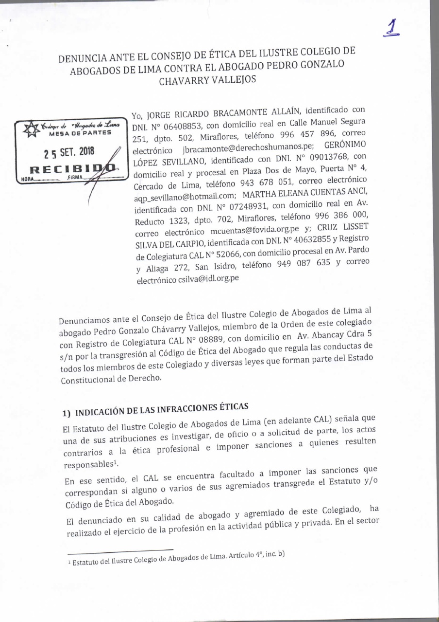 El titular del Ministerio Público (MP), Pedro Chávarry, afronta otra denuncia por violar la ética en su desempeño como fiscal de la Nación. Un grupo de ciudadanos lo ha demandado ante el Comité de Ética del Colegio de Abogados de Lima (CAL).