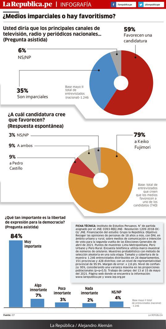 Aproximadamente un 59% de los peruanos advierte que los principales canales de televisión, emisoras de radio y periódicos nacionales favorecen una de las candidaturas en carrera por llegar al gobierno. Es decir, es claramente mayoritaria la percepción de que esta prensa beneficia a una de las postulaciones presidenciales.