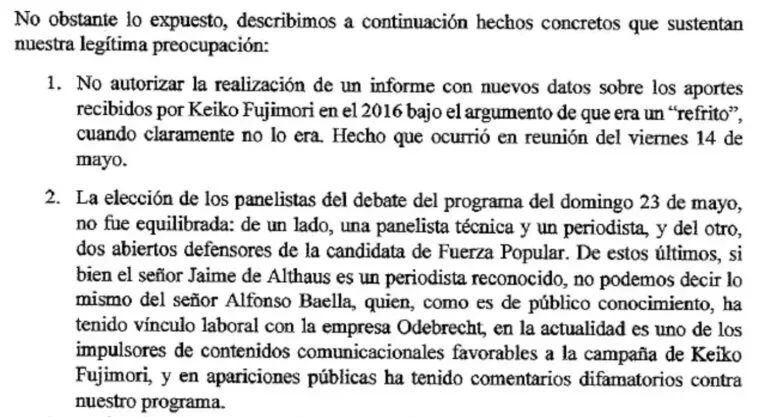 Ambos cuestionaron la parcialización en beneficio de Keiko. “Lo que interpretamos como una flagrante violación de los principios rectores que rigen nuestro quehacer periodístico. (…) No transmitir los dos cierres de campaña de los candidatos a la presidencia de la República en forma alternada y equitativa en nuestra pantalla quiebra dichos principios”.