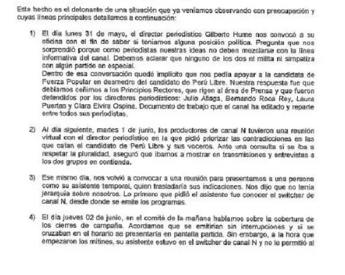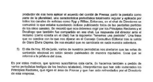 “Lejos de atender nuestras legítimas preocupaciones (…), el director periodístico, señor Gilberto Hume, señaló abiertamente que a la empresa la preocupaba la candidatura de Pedro Castillo, que le parecía un peligro atentar contra la democracia y la libertad y que había que tomar partido en su contra”. La carta también detalla que Hume ordenó disminuir la presencia de Pedro Castillo y aumentar la de Keiko Fujimori, violando los principios rectores de los programas periodísticos que promueven la pluralidad en las campañas electorales.