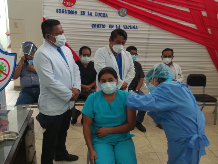 Tal como ocurrió en marzo pasado con la aplicación de la primera dosis al personal de salud, el médico intensivista del hospital Santa Rosa, Jaime Rivas Valverde, es el primero en recibir esta dosis de refuerzo.