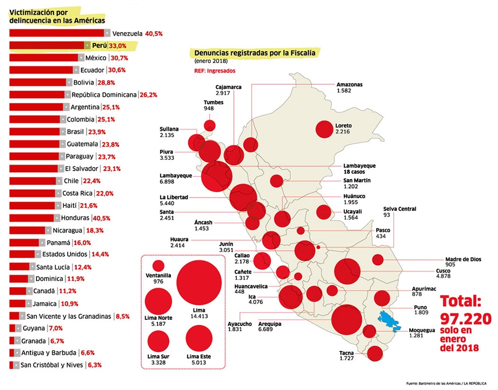 «Desde las primeras encuestas, el Perú ha mostrado altos niveles de victimización por delincuencia, en términos comparados. En el 2017, le siguieron de cerca México y Ecuador en el tercer y cuarto lugar», manifestó Patricia Zárate, investigadora principal del Instituto de Estudios Peruanos (IEP) que realizó la investigación en nuestro país con el apoyo de la Agencia de los Estados Unidos para el Desarrollo Internacional (USAID).