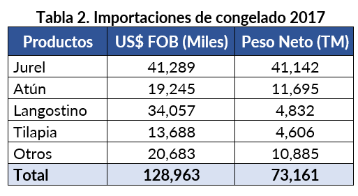 Un rubro clave para las importaciones de productos hidrobiológicos, es el de congelados. En este rubro, la especie más importante, por valor y peso, es el jurel entero congelado (32% proveniente de Chile), seguido por el atún, langostino y tilapia (Tabla 2).