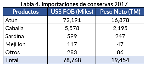 Respecto a las conservas, las de atún provenientes de Tailandia constituyen la mayoría de la importación en este rubro con 92% del total.