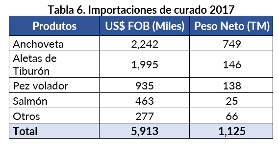 El principal producto curado que se importó en el 2017 fue anchoveta proveniente de Argentina, con certificación MSC para la producción de anchoas; seguida por las aletas de tiburón debido a su valor y volumen (Tabla 6). Aproximadamente la mitad de estas aletas provienen de Ecuador y la diferencia de aguas internacionales.