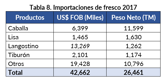 Los principales productos importados en el rubro de fresco, en relación al volumen; son la caballa, seguida de la lisa y el langostino, todos provenientes de Ecuador (Tabla 8). Cabe resaltar que aunque el langostino es el 5 % del volumen importado, significa 31 % en valor, por lo que es el producto fresco importado de mayor importancia económica.