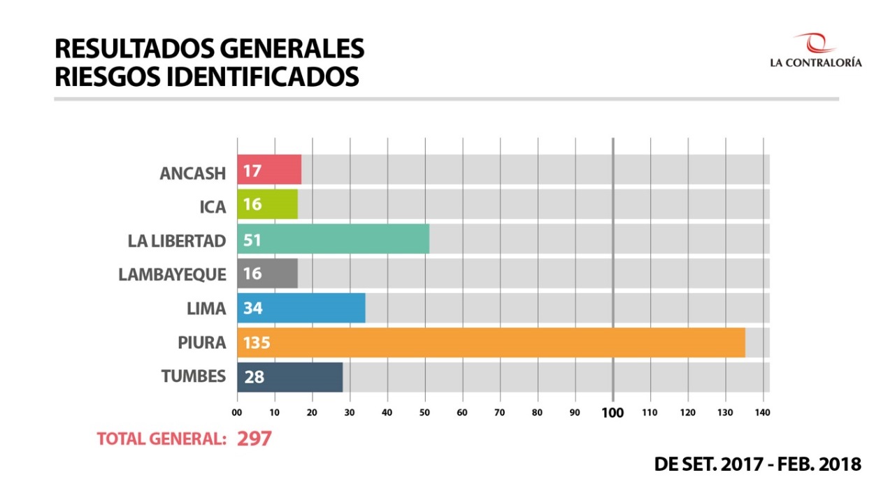 En dicho periodo la Contraloría ha emitido 101 informes de control, detectando 297 riesgos en el proceso de Reconstrucción de siete regiones. Después Piura, figuran La Libertad (51), Lima (34), Tumbes (28), Áncash (17), Lambayeque (16) e Ica (16).