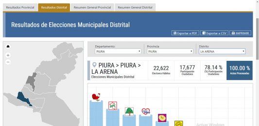 Según la revisión de CUTIVALÚ en el portal oficial de la Oficina Nacional de Procesos Electorales (ONPE), 22 distritos de la región Piura ya tienen virtuales alcaldes. En ellos destacan cuatro mujeres que se convierten en las futuras alcaldesas de Morropón y Salitral (Morropón), Amotape (Paita) y Lobitos (Talara) para el periodo 2019- 2022. LEER … Sigue leyendo Piura: 22 distritos de la región ya tienen virtuales alcaldes, según ONPE al 100 %