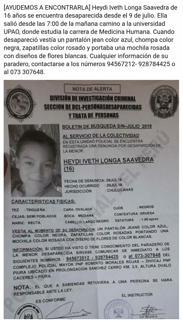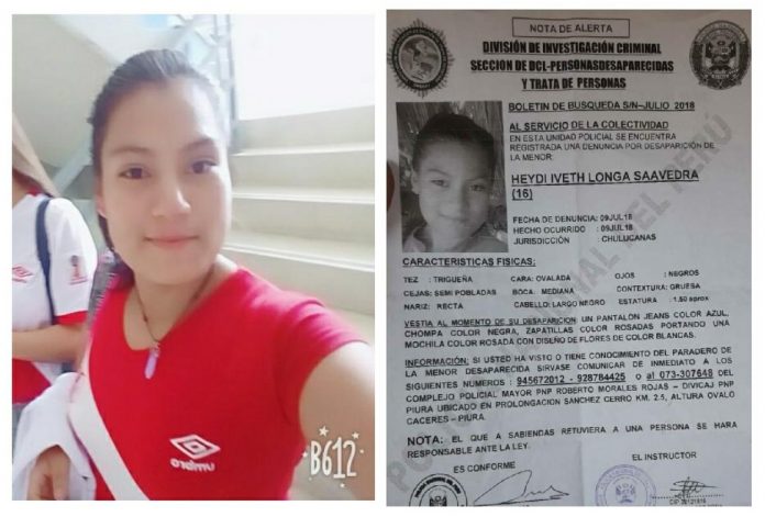 Una adolescente de 16 años se encuentra desaparecida en Piura y sus familiares la buscan desesperadamente. Se trata de Heydi Iveth Longa Saavedra, estudiante de Medicina Humana de la Universidad Privada Antenor Orrego (UPAO) filial Piura.