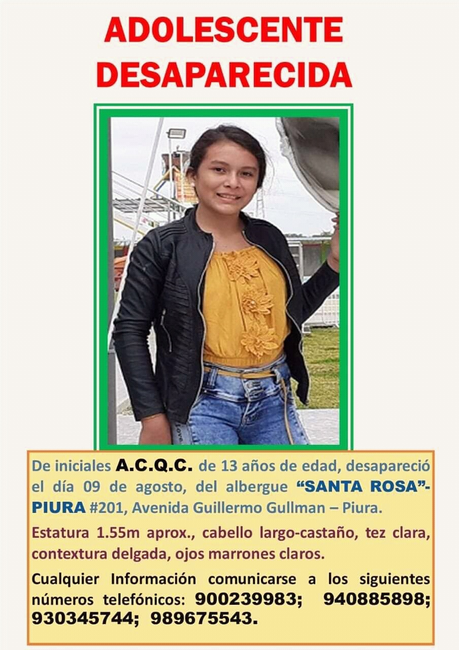 Los familiares de Ana Cecilia y parte del personal educativo del colegio San José de Viviate (Paita) realizaron la mañana de este martes un plantón frente al albergue Santa Rosa de Piura para reclamar acciones sobre la desaparición de la menor. “Anita” residía en Paita, fue transferida al albergue Santa Rosa en Piura el 03 de agosto y desapareció casi una semana después, el 09 de agosto.
