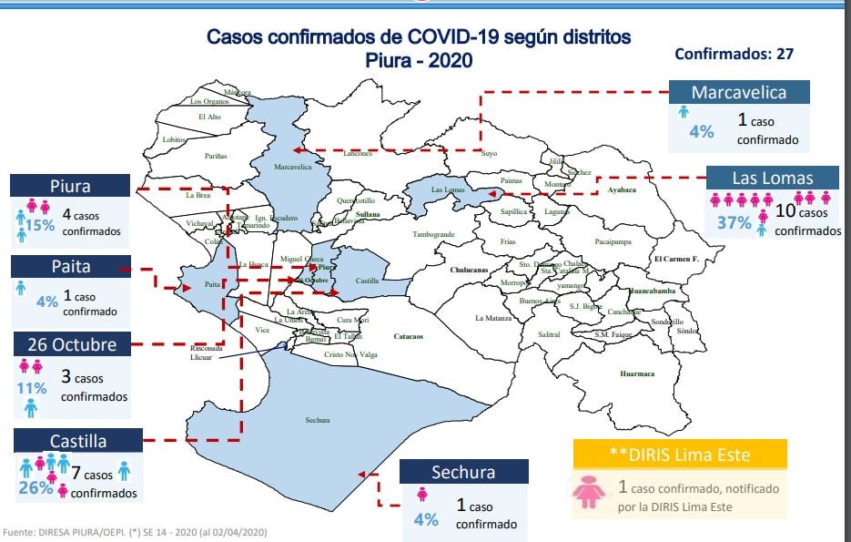 A nivel regional son 27 los casos confirmados de coronavirus, de los cuales una persona falleció el pasado 21 de marzo. Sobre los cinco hospitalizados en cuidados intensivos se conoce que uno de ellos es procedente de Paita y otro de Piura distrito. Sobre los otros tres nuevos casos no se han pronunciado las autoridades.