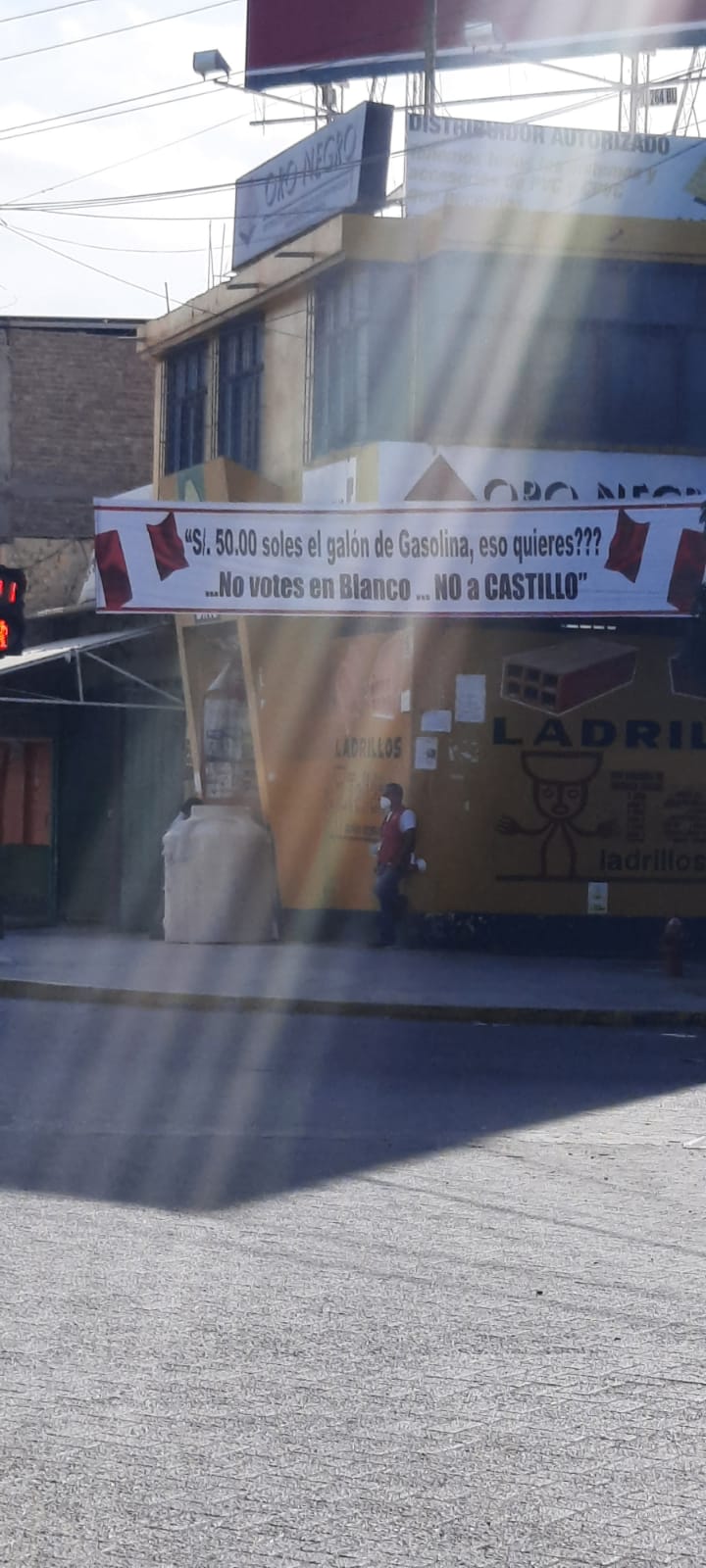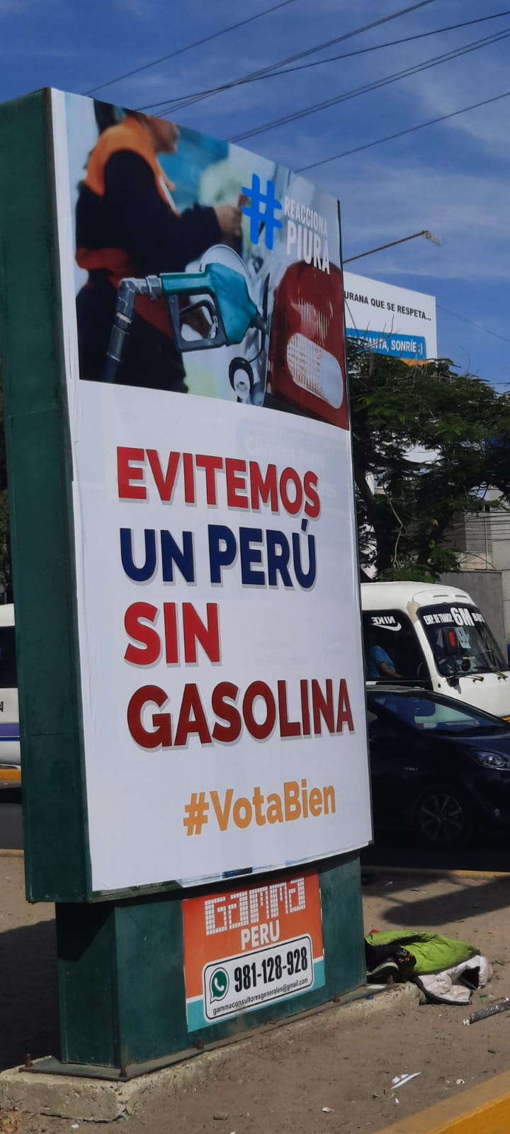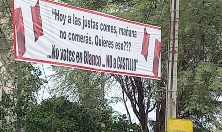 Otro cartel se ubica cerca al cruce de la avenida Ex Country con la Sullana, a pocos metros del Mercado de Telas. En este dice: “Hoy a las justas comes, mañana no comerás ¿Quieres eso? No votes en blanco, no a Castillo”.