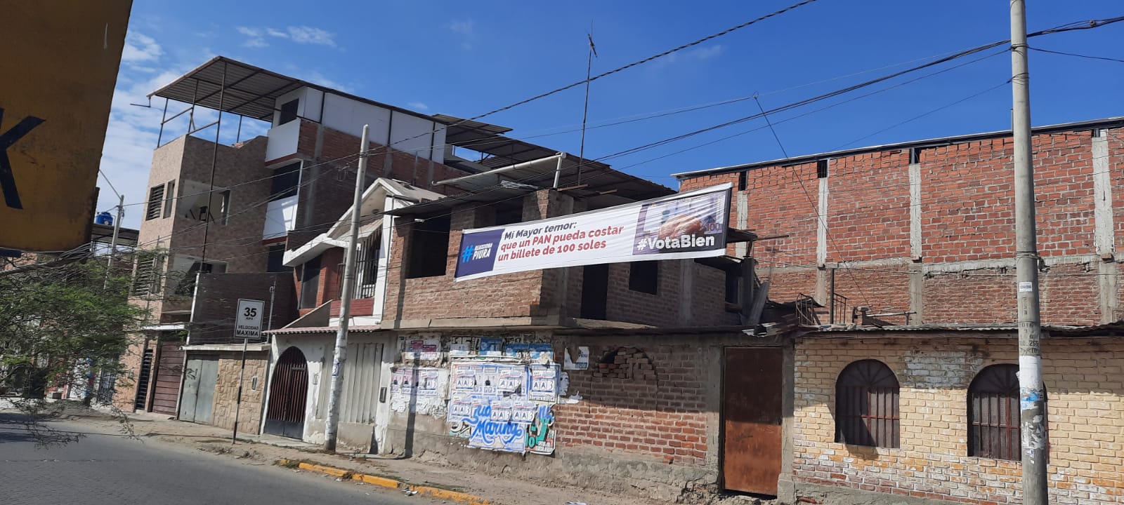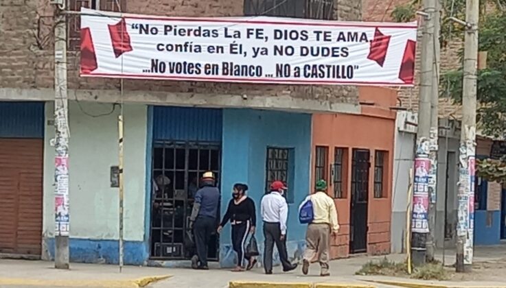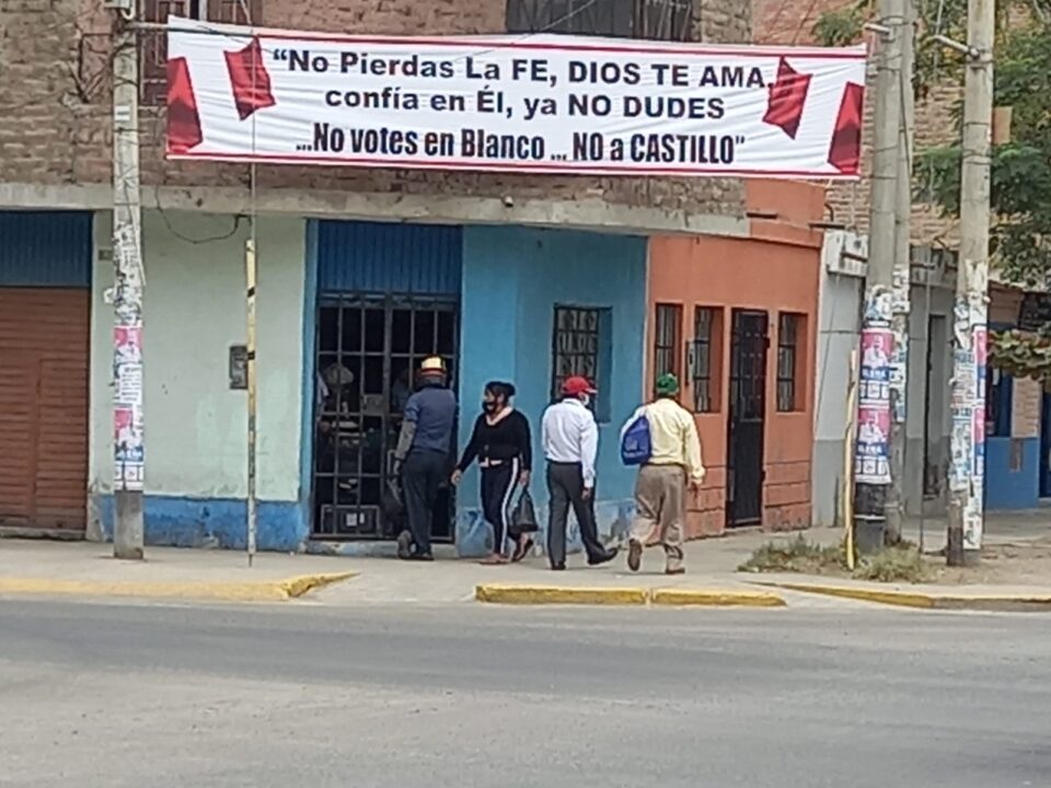 A solo unas cuadras del mercado central de Piura y del colegio Víctor Rosales, que es, además, un local de votación se ubica una pancarta colgada entre dos postes de energía eléctrica en la que se lee el siguiente mensaje: No pierdas la fe, Dios te ama, confía en él, ya no dudes. No votes en blanco…No a Castillo”. Esta pancarta está ubicada exactamente frente al centro de Salud de Pachitea.