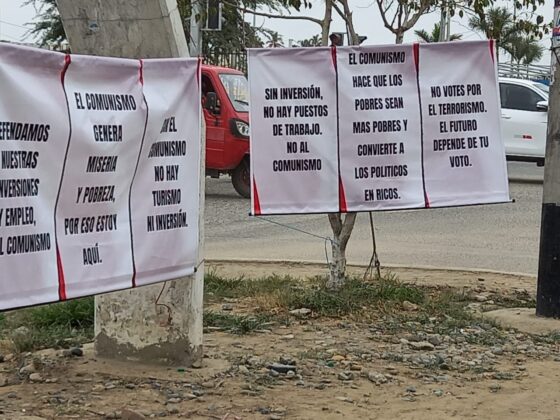 Al mismo estilo de los grandes paneles que aparecieron en todo Lima en contra de la candidatura de Pedro Castillo a la presidencia del país, el distrito de Piura se encuentra invadido de carteles y pancartas con mensajes de miedo y contracampaña hacia el candidato de Perú Libre.