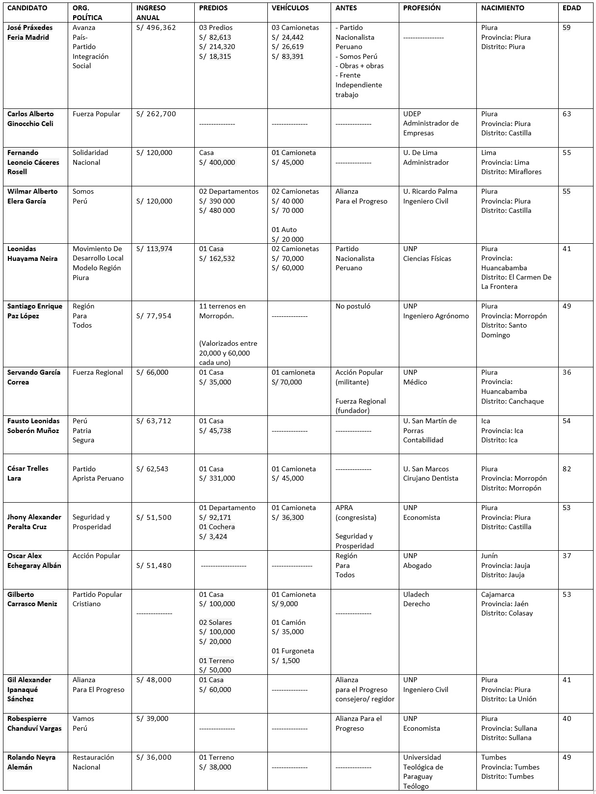 Según la información publicada en el portal del Jurado Nacional de Elecciones (JNE), de los candidatos a gobernador regional de Piura, José Práxedes Fería Madrid, del partido Avanza País – Partido Integración Social, es el candidato que más ingresos mensuales obtiene.