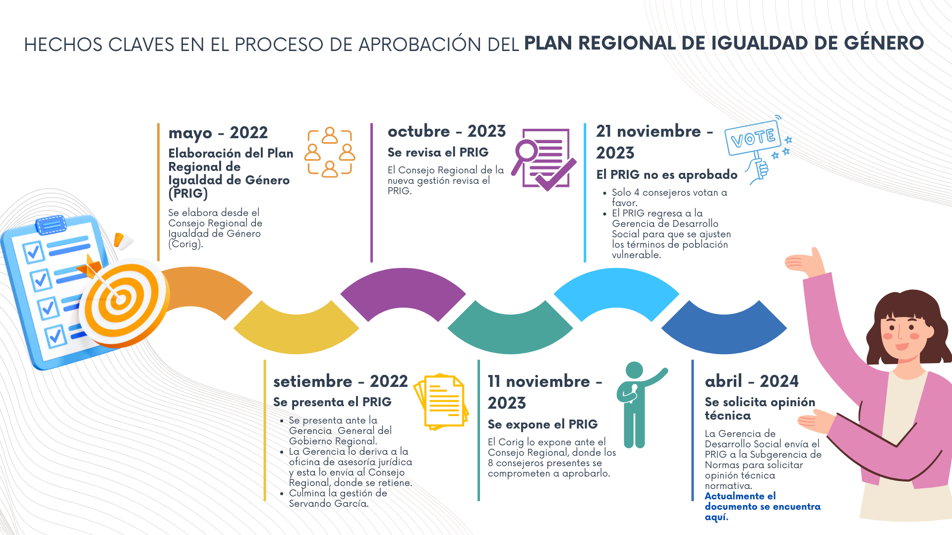 Desde el 2022, el Consejo Regional de Igualdad de Género (Corig) presentó el PRIG ante la Gerencia de Desarrollo Social de la anterior gestión, quien a su vez la elevó a dicho Consejo Regional. Sin embargo, durante ese año, no hubo respuesta por parte del Estado.