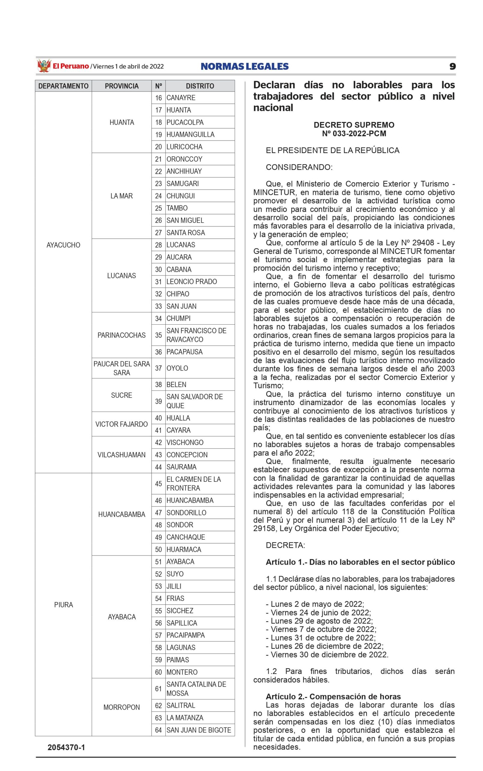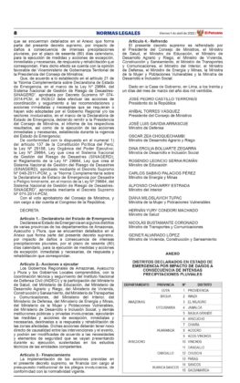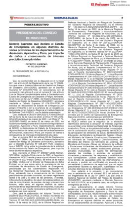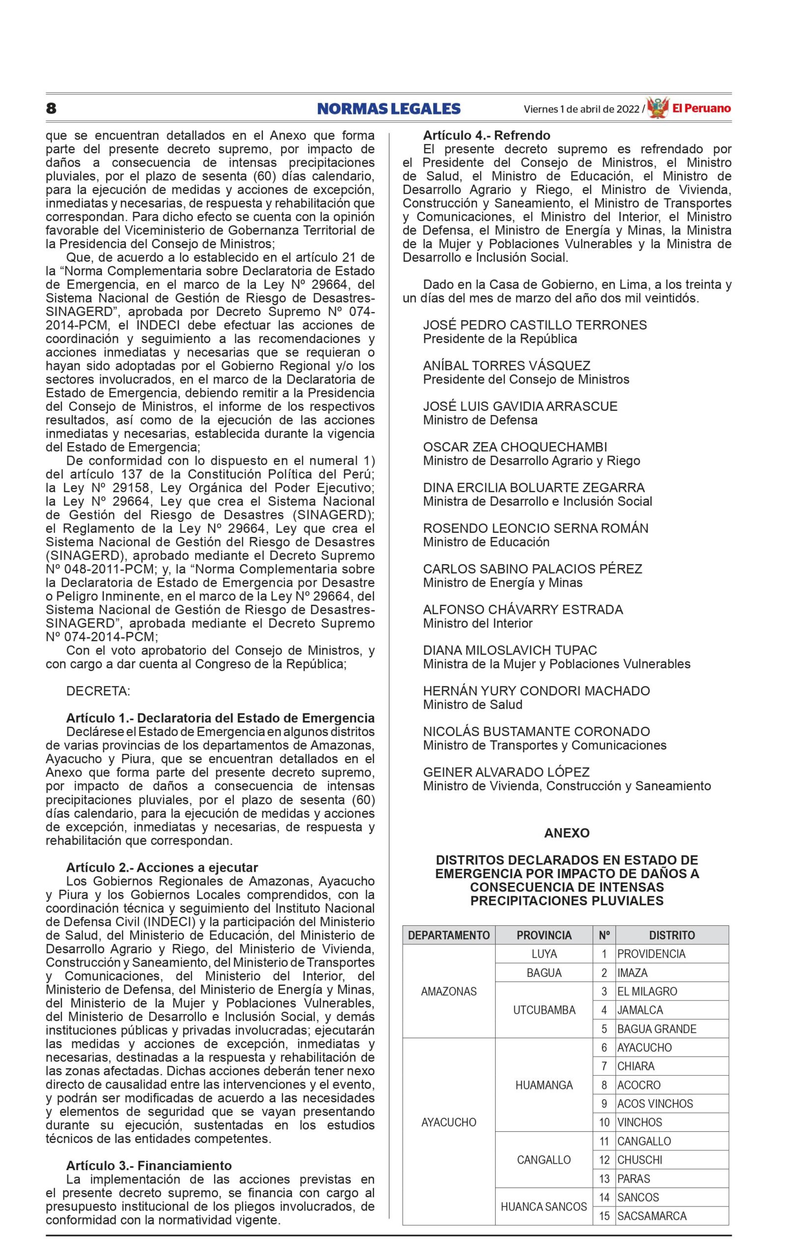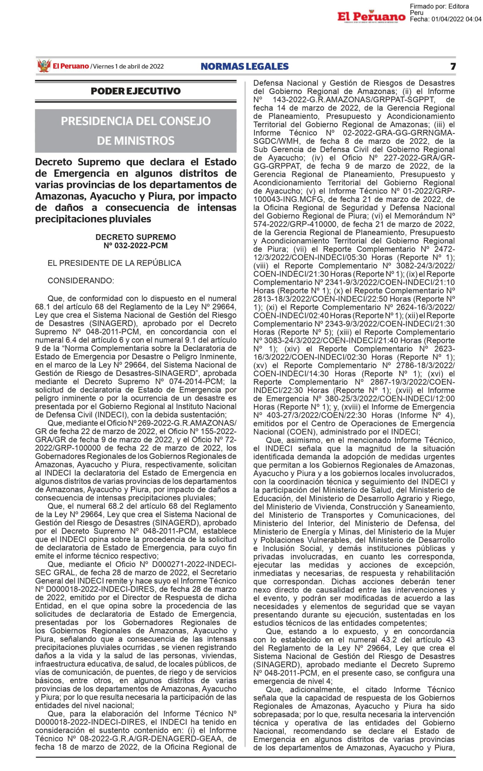 De acuerdo al decreto supremo N° 32-2022-PCM el Ejecutivo declaró en emergencia por el impacto de las lluvias a 20 distritos de las provincias de Morropón, Ayabaca y Huancabamba por un plazo de 60 días calendario.