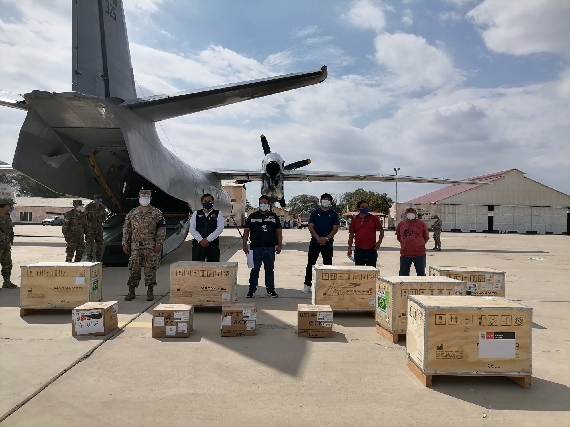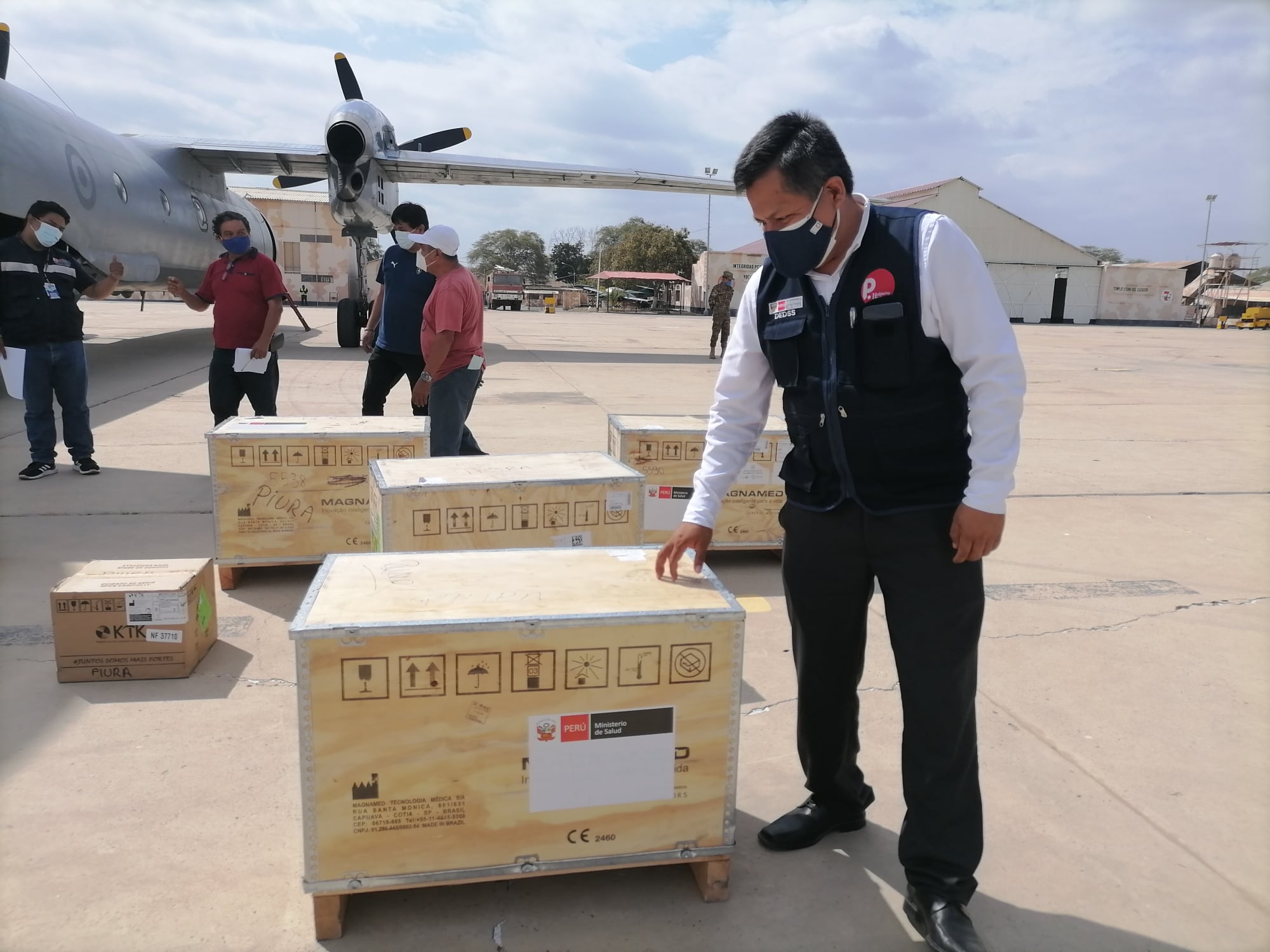 El director regional de Salud, José Nizama Elías, llegó hasta las instalaciones del Grupo Aéreo N° 7 de la Fuerza Aérea del Perú para recoger estos equipos que serán distribuidos al ambiente de Cuidados Críticos del hospital de contingencia ubicado en el Estadio Campeones de 36 de Sullana y van a contribuir a mejorar la atención en cuidados intensivos.