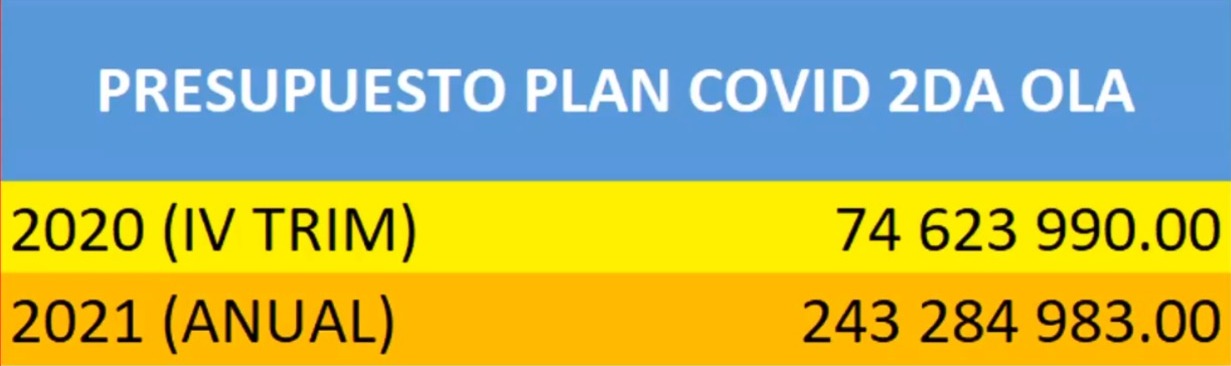Para el último trimestre del 2020, se ha utilizado todos los saldos presupuestales generando un presupuesto de 74 millones 623 mil 990 soles. Asimismo, el presupuesto requerido para el año 2021 es de 243 millones 284 mil 983 soles.