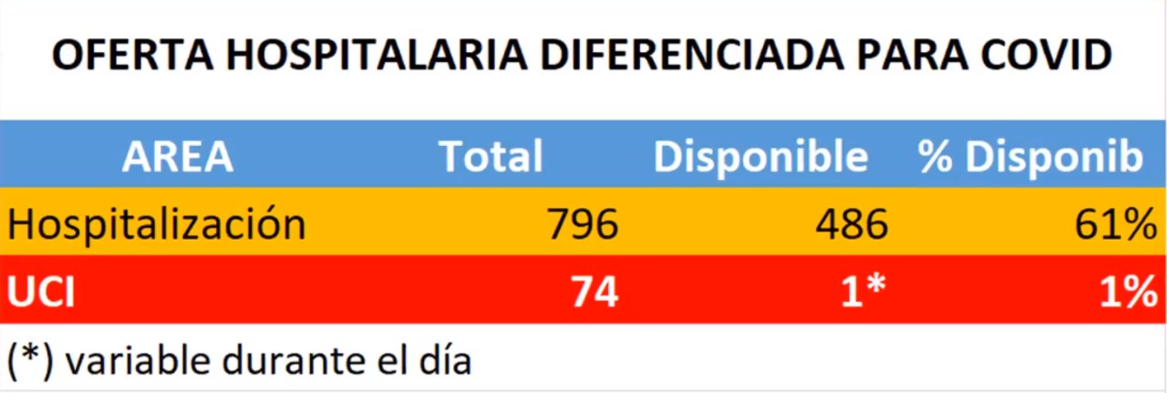 En cuanto a la disponibilidad de camas hospitalarias para paciente covid en la región, el especialista sostuvo que de las 796 camas de hospitalización, hay disponibles 486 y de las 74 camas UCI sólo hay 1 disponible.