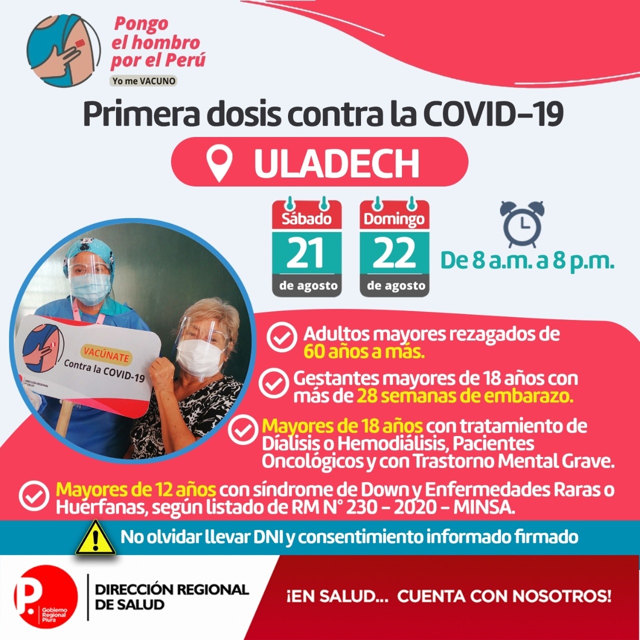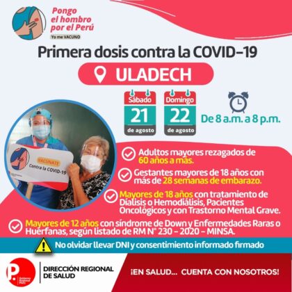 Este viernes llegaron a Piura 44 mil 460 vacunas contra la covid, de las cuales 27 mil 780 serán para la aplicación de la segunda dosis y 16 mil 680 para la primera dosis, durante la jornada de vacunación de este sábado 21 y domingo 22 de agosto.