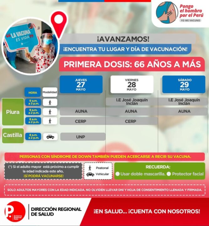 La Dirección Regional de Salud informó que el 27, 28 y 29 de mayo se aplicará la primera dosis de la vacuna Pfizer a los adultos mayores de 66 años de Piura y Castilla. Las jornadas de vacunación serán desde las 8:00 a.m hasta las 2:00 p.m.