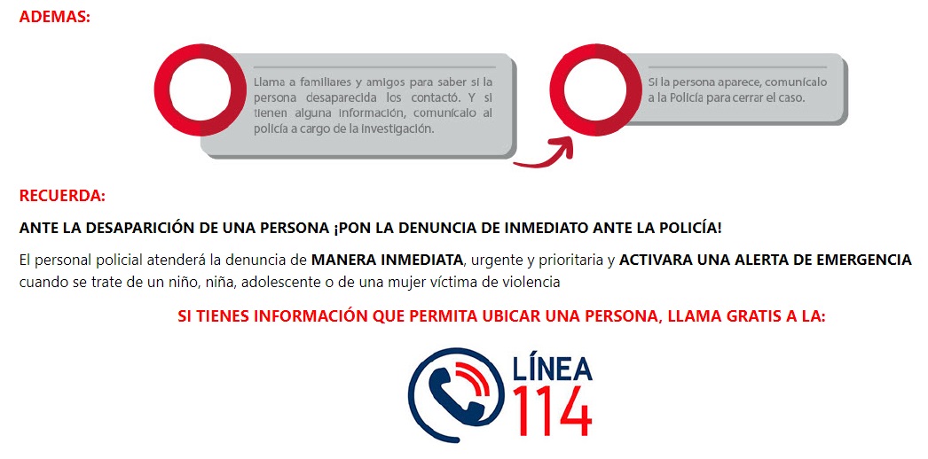 Asimismo, este portal llamado “Desaparecidos en Perú” informa que se encuentra habilitada la línea 114 de manera gratuita para reportar una posible desaparición.