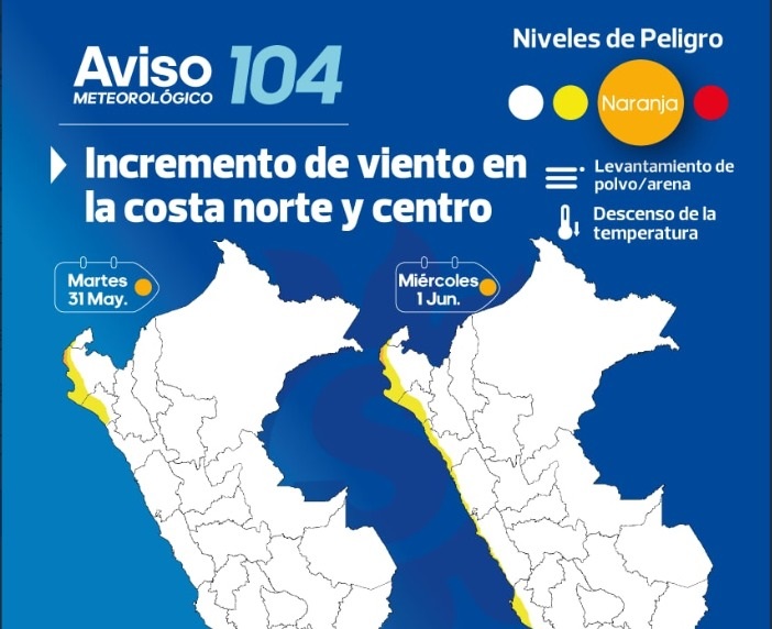 A la fecha está vigente la Alerta por incremento de vientos en la costa norte, incluida la costa de Piura. Dicha alerta se emitió el 30 de mayo, en todas las plataformas del senamhi.