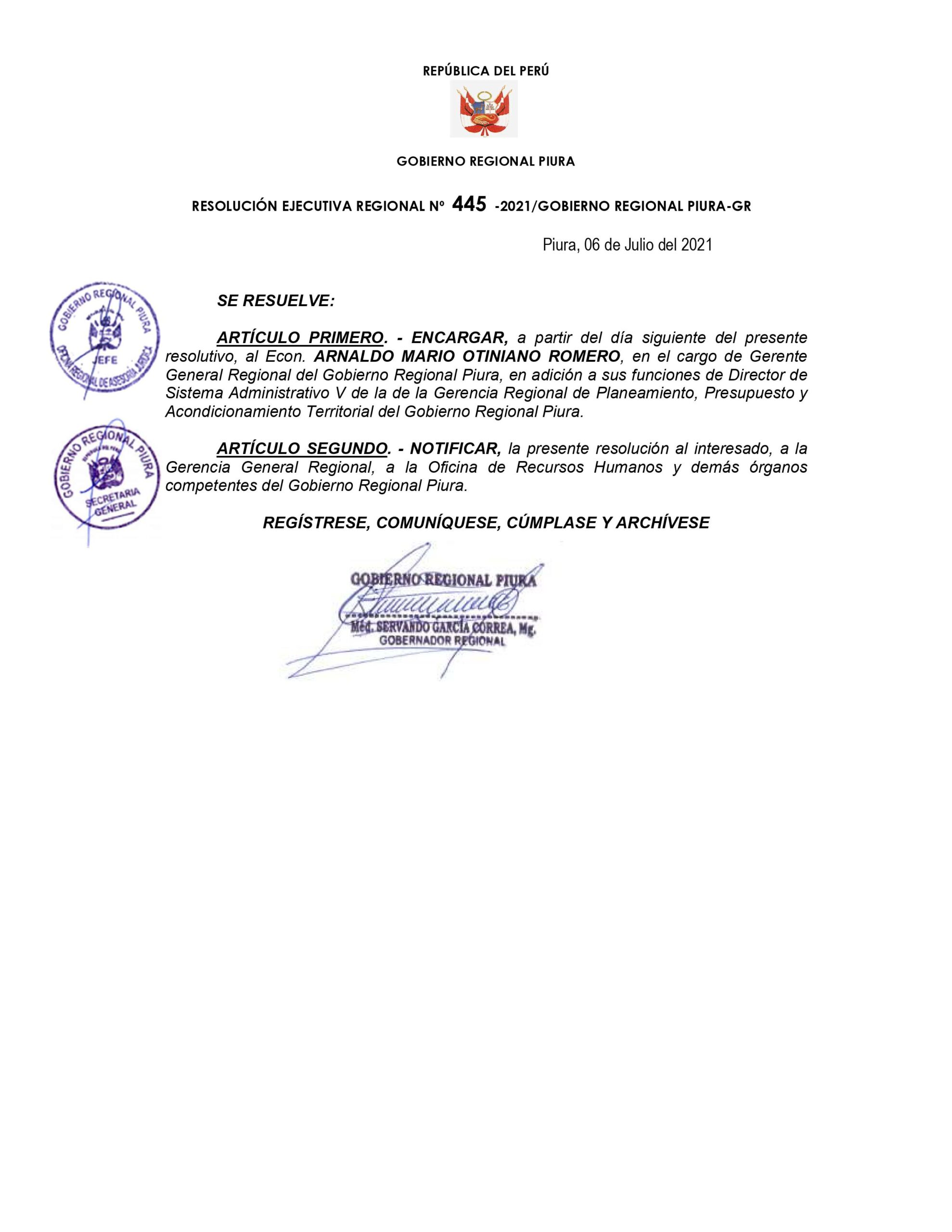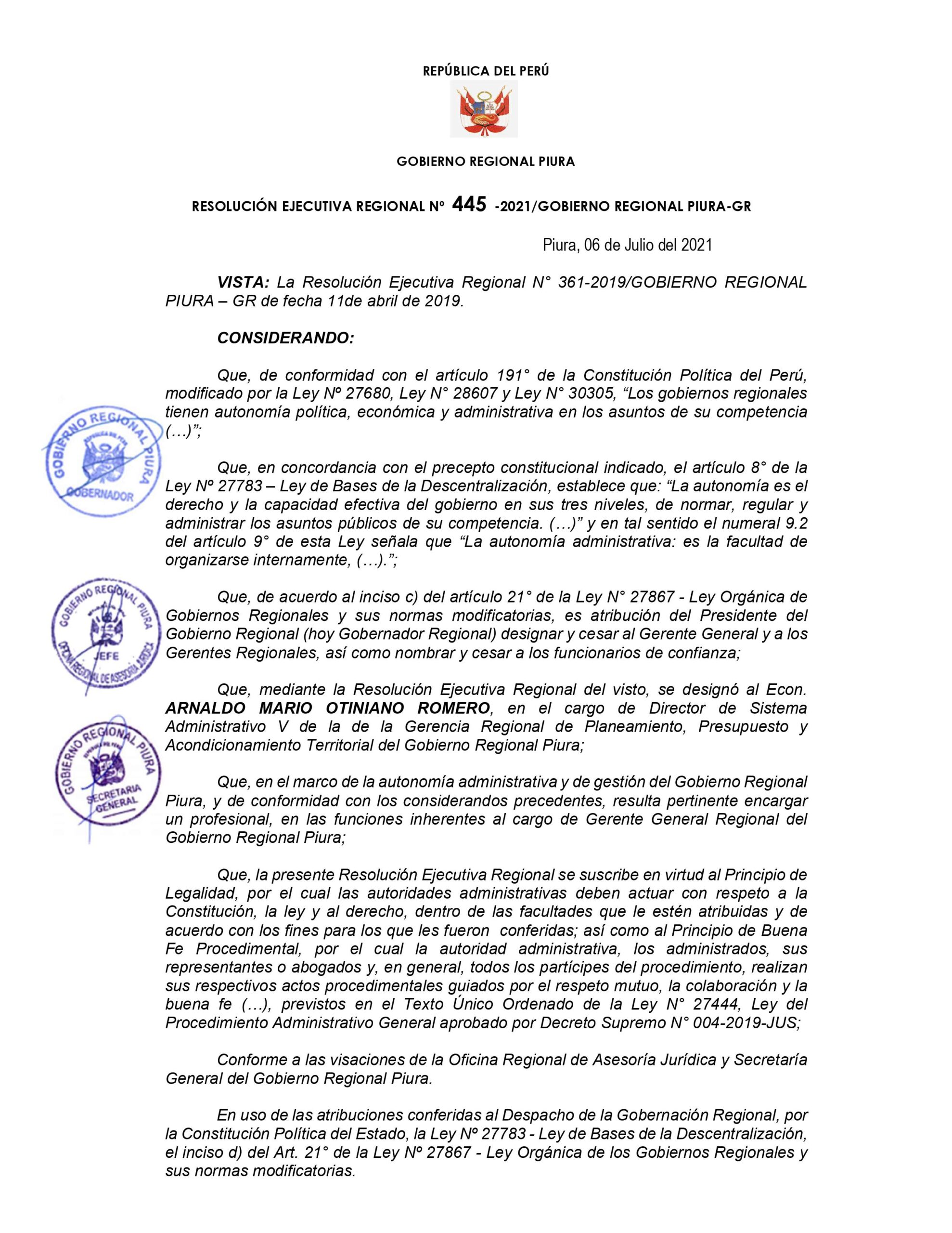 En lugar de Fernando Ruidias Ojeda ha sido designado como gerente general encargado el economista Arnaldo Mario Otiniano Romero, según se lee en la Resolución Ejecutiva Regional N° 445-2021, firmada por el gobernador Servando García y publicada este martes 6 de julio.