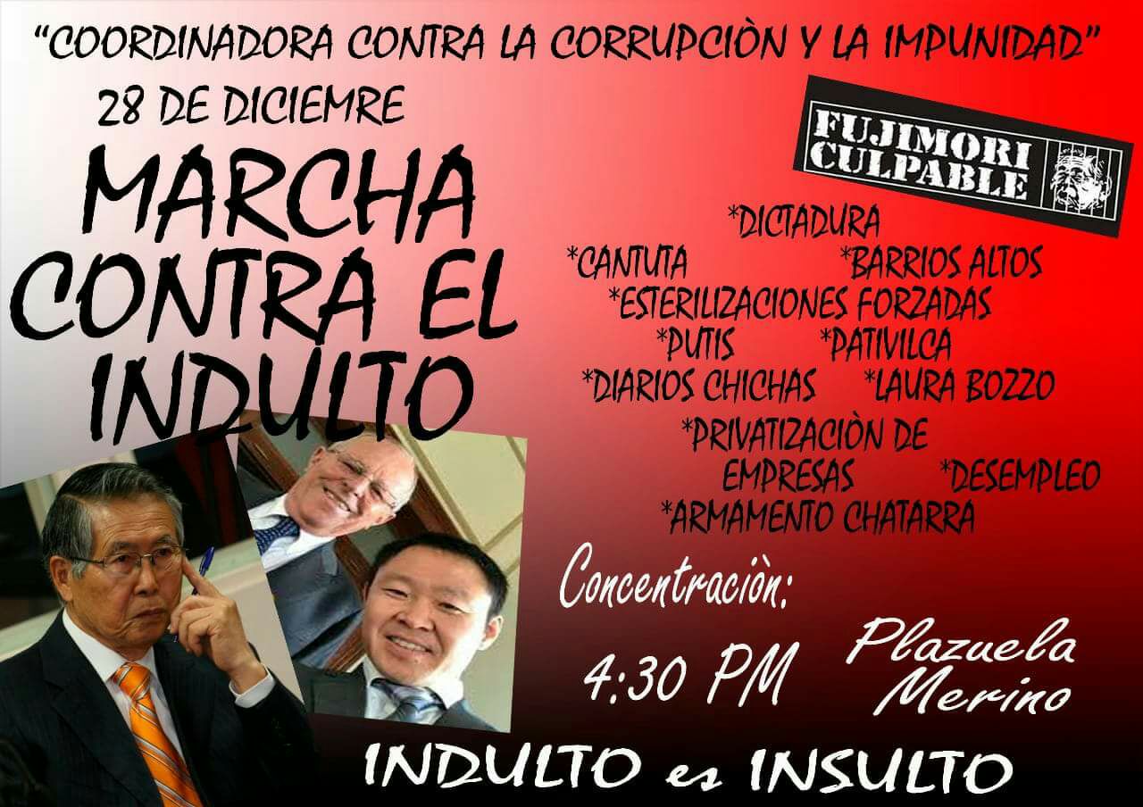 La manifestación “Indulto es Insulto” partirá de la Plazuela Merino, recorrerá las principales calles del centro de Piura y llegará a la Plaza de Armas. Según Eliany Vargas, los organizadores han tomado conocimiento de la posible realización de una marcha en apoyo al indulto, que sería a la misma hora.