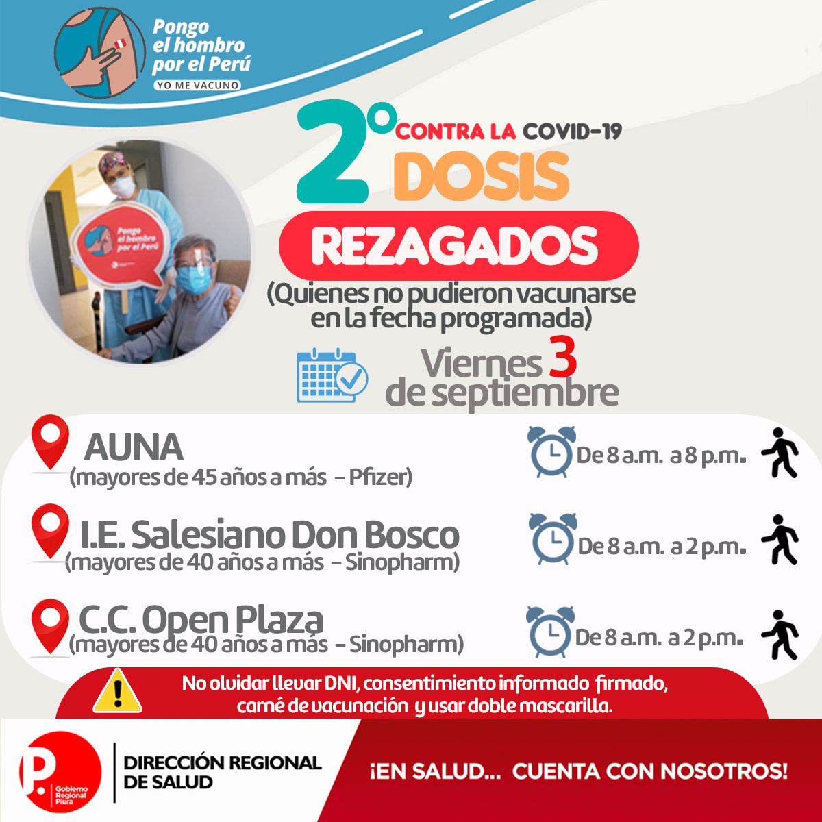 No olvides llevar DNI, carné de vacunación, consentimiento informado firmado y usar doble mascarilla. Descarga el formato de consentimiento aquí:  https://cutt.ly/dQ0NpBD