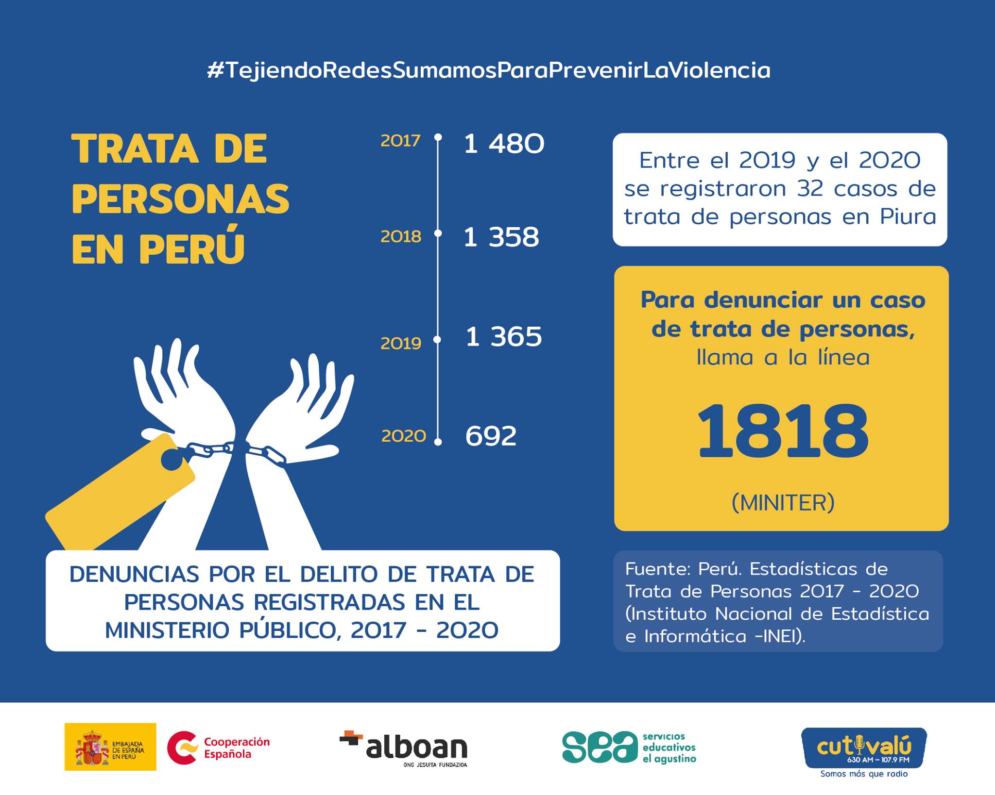 De acuerdo a cifras publicadas por el INEI, en el 2020, el Ministerio Público registró 692 casos de trata de personas en el Perú. 32 de estos casos fueron reportados en la región Piura.
