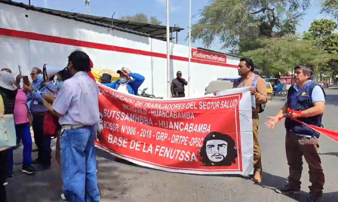 Con arengas y carteles en mano, integrantes de la Federación Nacional Unificada de Trabajadores del Sector Salud (Fenutssa), protestaron en los exteriores del Gobierno Regional para exigir a la autoridad, Servando García, escuche su pliego de reclamos.
