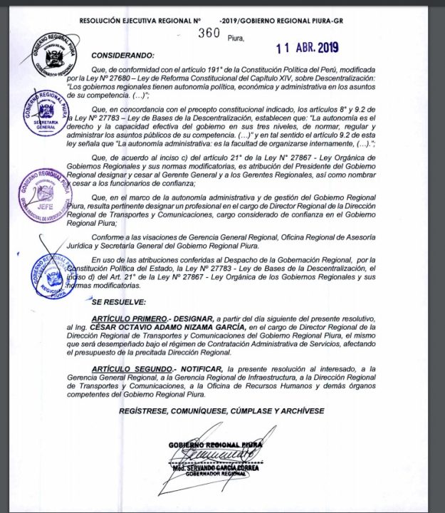 Asimismo en la resolución ejecutiva 360-2019 se informaba que el cargo será asumido desde este viernes por el ingeniero, César Octavio Adamo Nizama García.