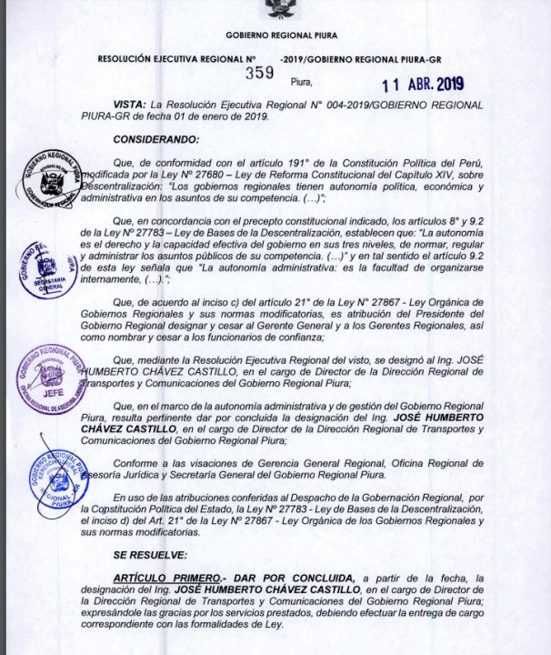 A través de la resolución ejecutiva 359-2019 el gobernador regional, Servando García Correa dio por concluida la designación del ingeniero, José Humberto Chávez Castillo como Director Regional de Transportes y Comunicaciones del Gobierno Regional.