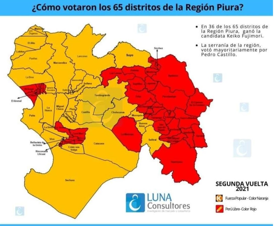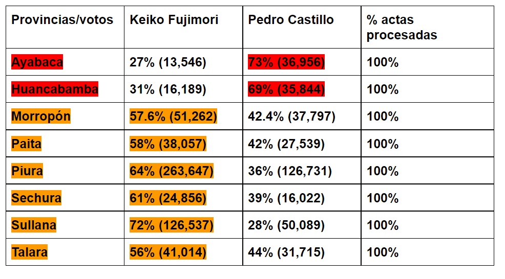 Los resultados de la segunda vuelta en la región Piura son una fotografía de lo que ha ocurrido en el país: una votación polarizada entre las zonas rurales y urbanas. En la región Piura, la candidata Keiko Fujimori se impuso con más del 60% de los votos (575,108), sobre todo en distritos de la costa y zona urbana.