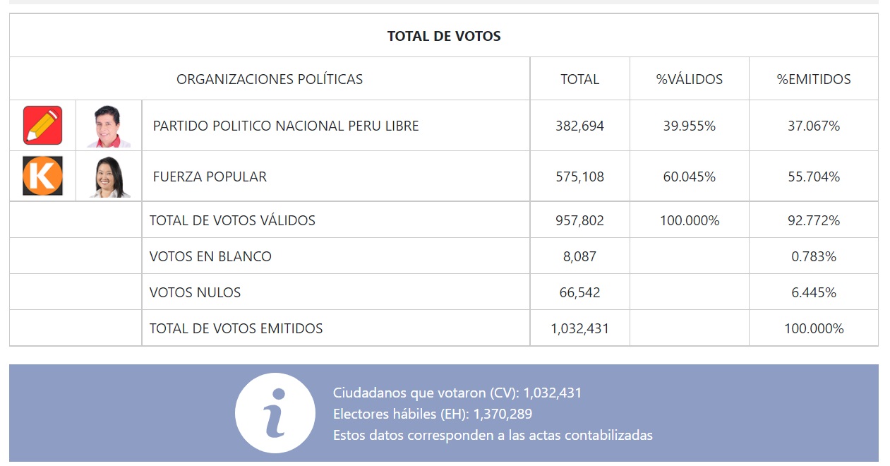 Por su parte, Pedro Castillo obtuvo un respaldo del 40% (382,694) en la región, gracias a la votación de las provincias de la sierra y los distritos de la zona rural, al 100% de actas procesadas.